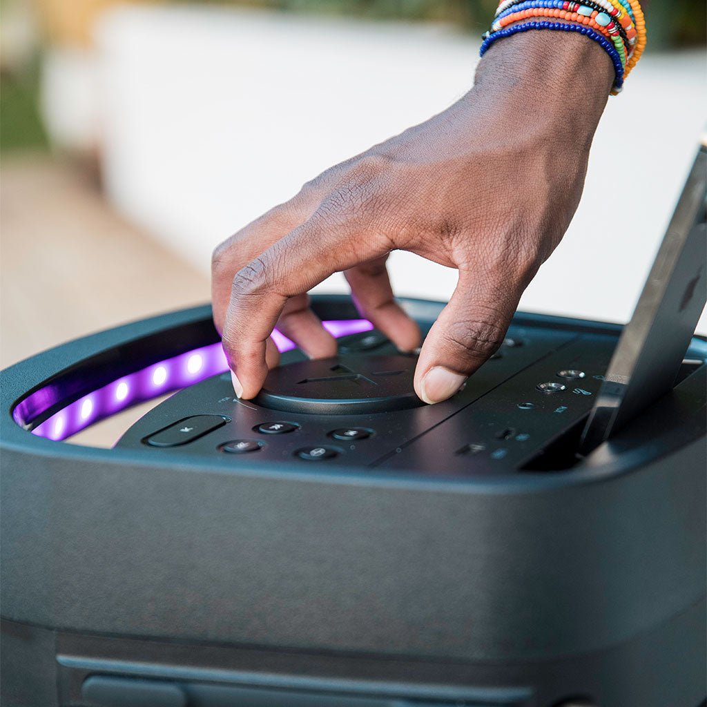 The X6 unleashes 160W of room-shaking sound and deep, heart-thumping bass to transform any moment into an unforgettable celebration. Its vibrant LED light show dances to the music, setting the perfect mood as your playlist fills the air. With microphone support, Duo Mode pairing for even bigger sound and a battery built to last, the X6 is your ultimate party companion.